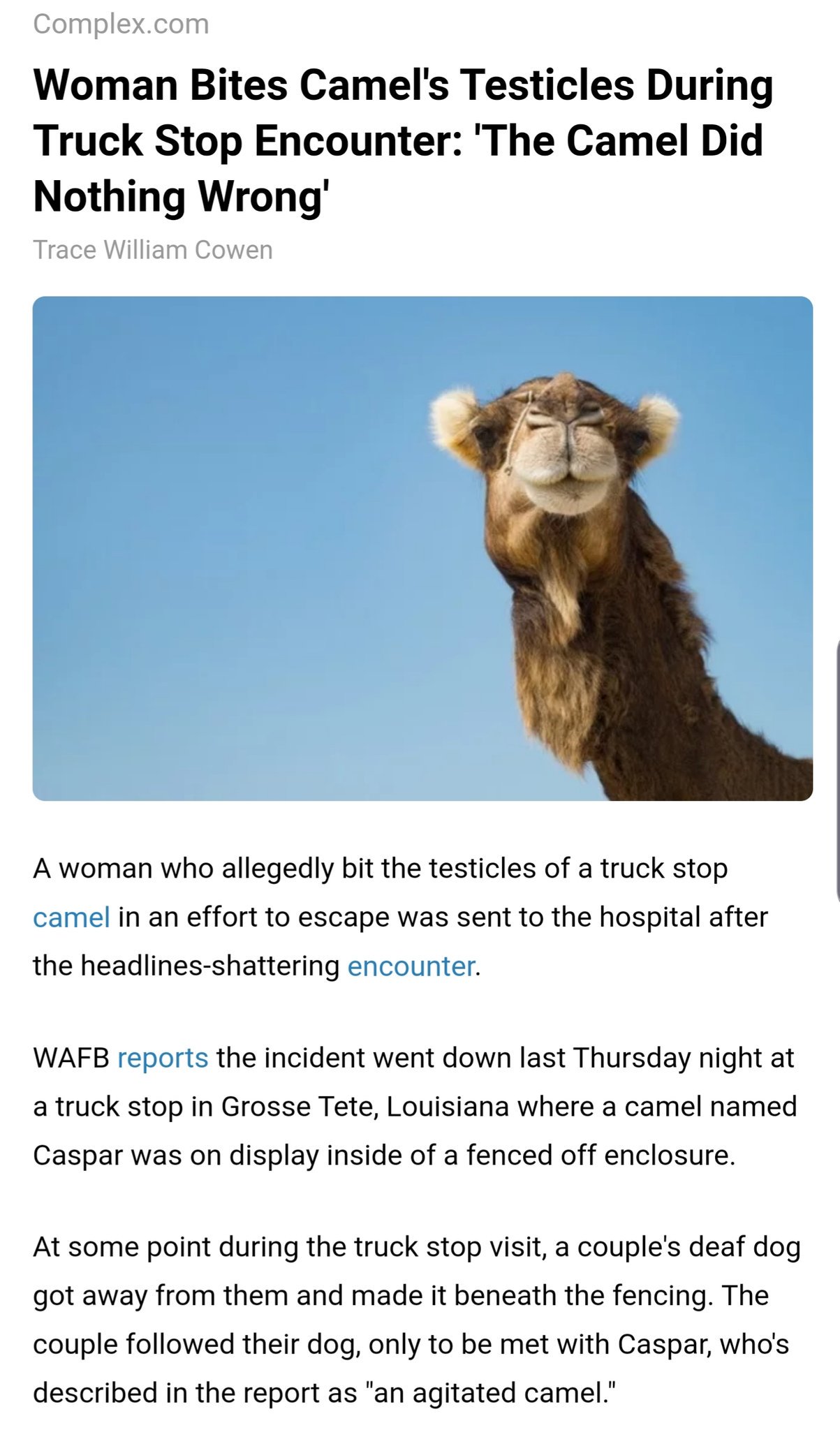 A woman in louisiana had to bite a camel that sat on her at a truck stop.